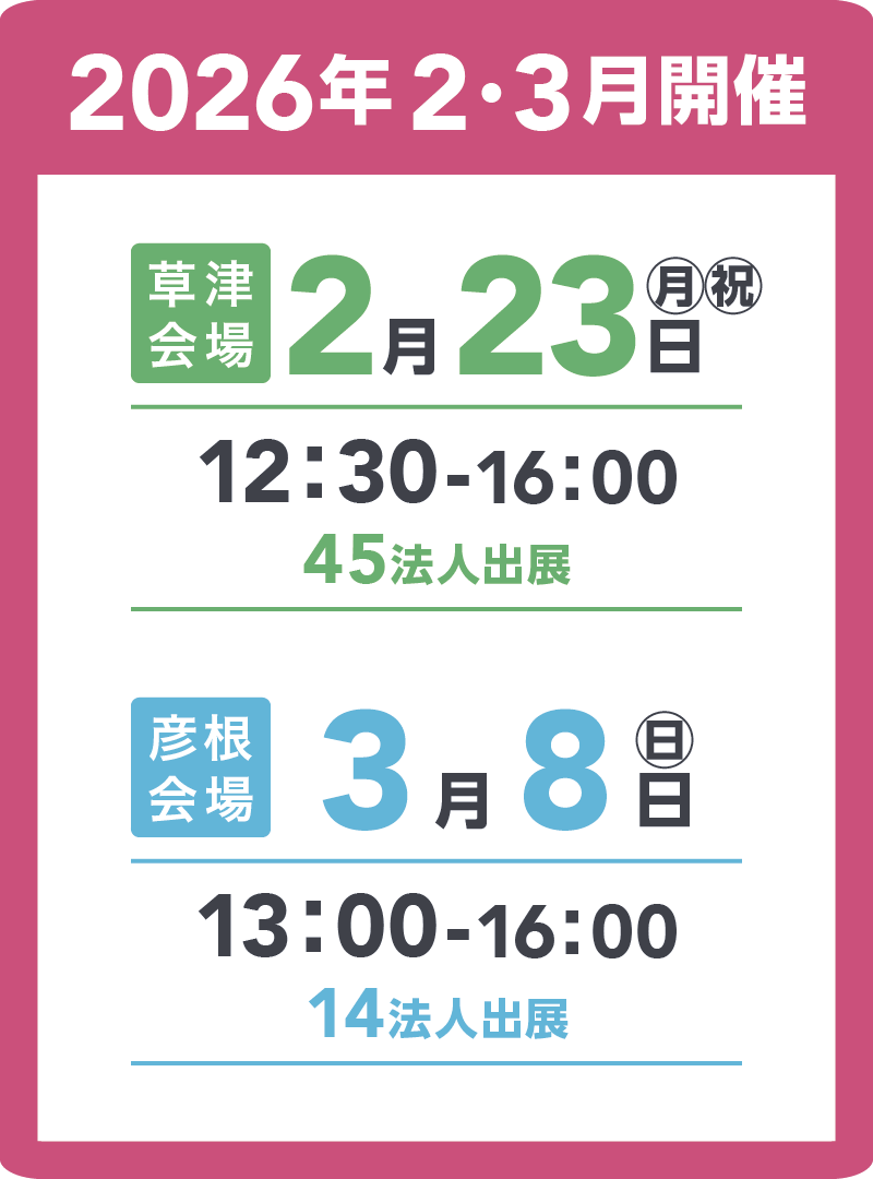 滋賀県内で、介護や福祉の職場へ就職や転職をお考えの方のための就職フェアです。 介護・福祉職場で働く先輩職員と出会い、カフェのような気軽な雰囲気の中での対話を通じて介護・福祉職場への理解を深めることができます。
