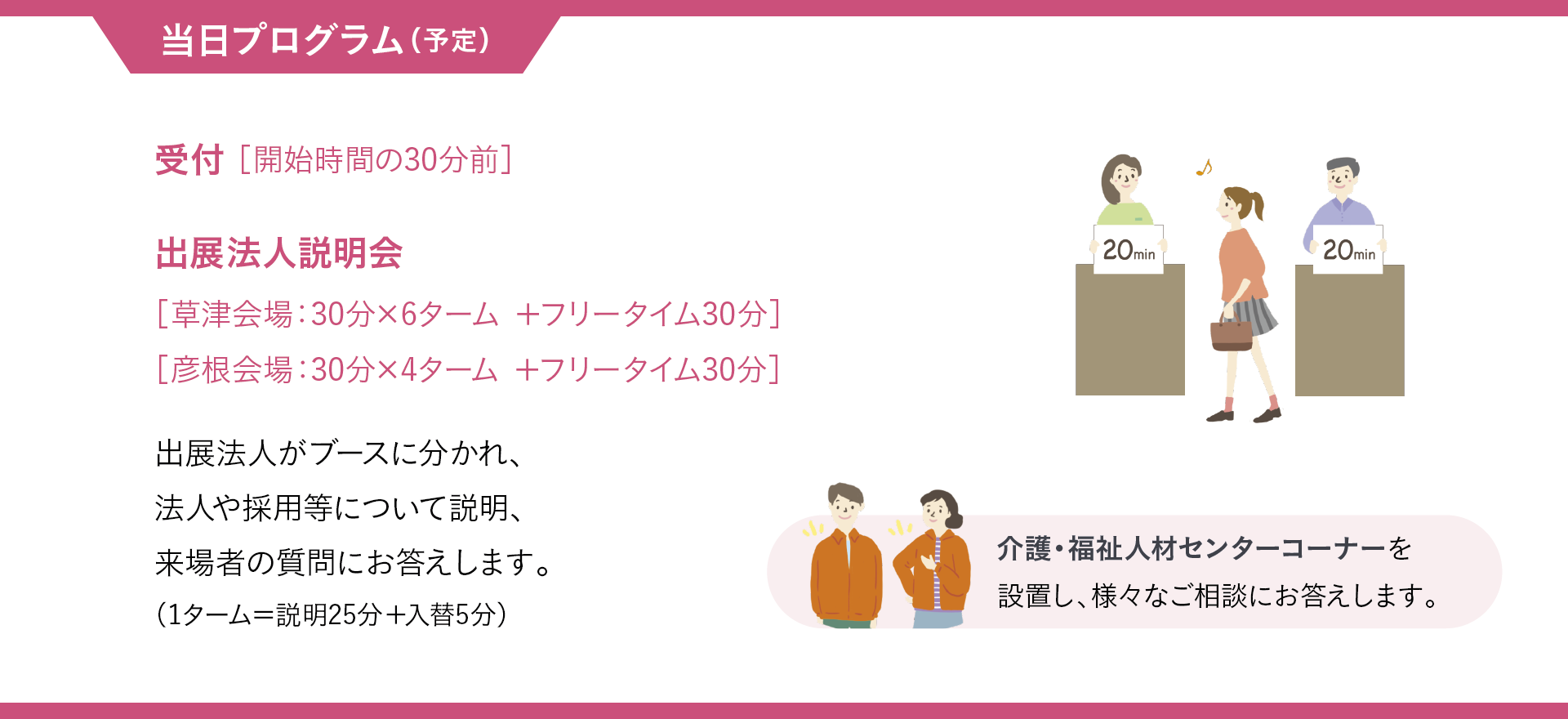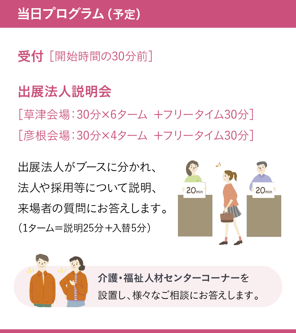 2日程・県内60の法人が出展する滋賀県最大の福祉就職フェアです。 ご好評いただいた前回に続き、2026年2・3月に開催します。この機会にぜひご参加ください!